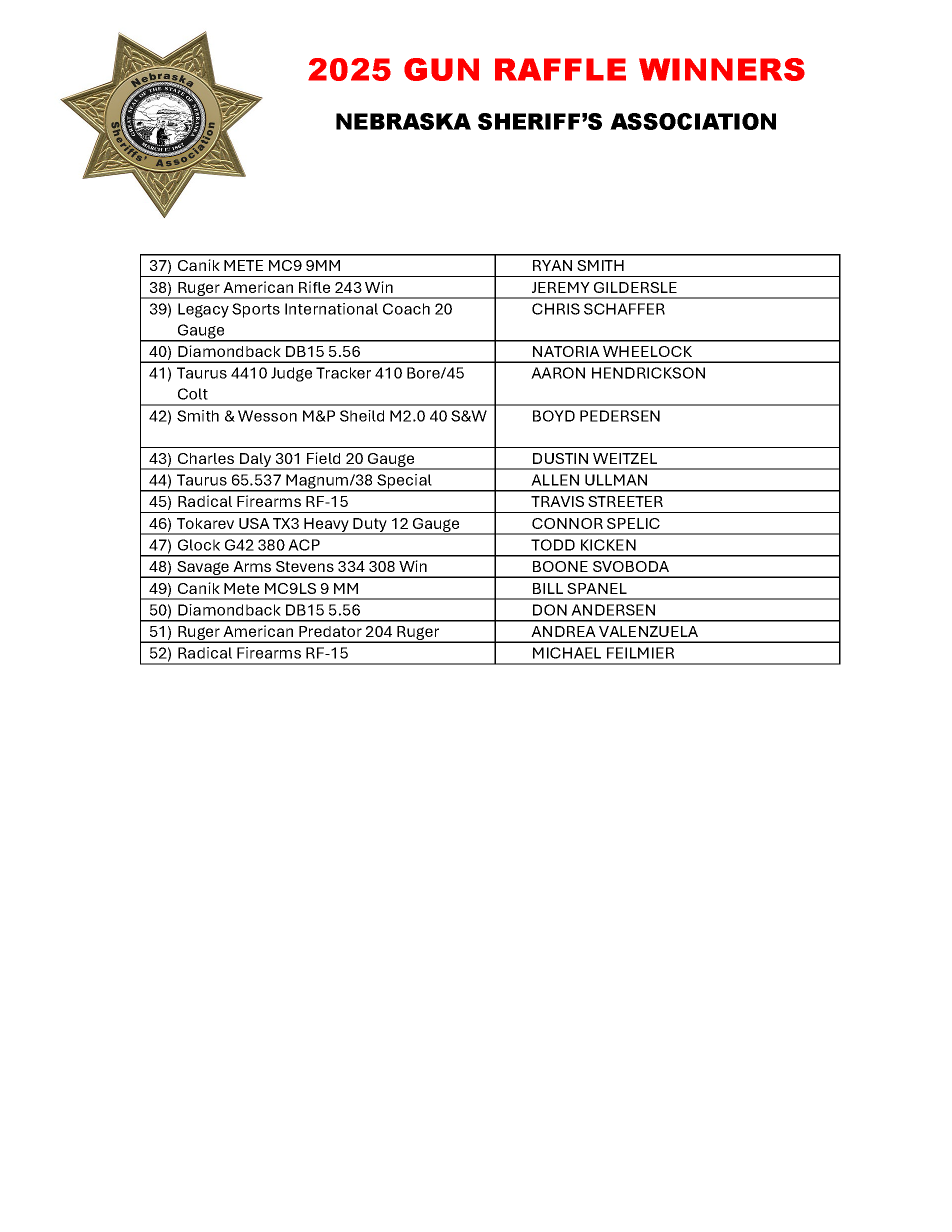 Congratulations to the winners for the 2025 Gun Raffle!